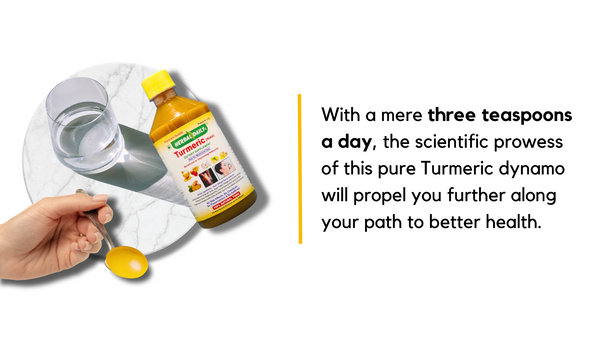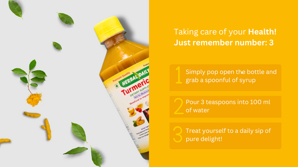 Dosage for Herbal Daily Turmeric Haldi Syrup: Take 3 teaspoons (15 ml) in 100 ml of water, once daily, on an empty stomach before breakfast. Do not eat anything for 30 minutes.