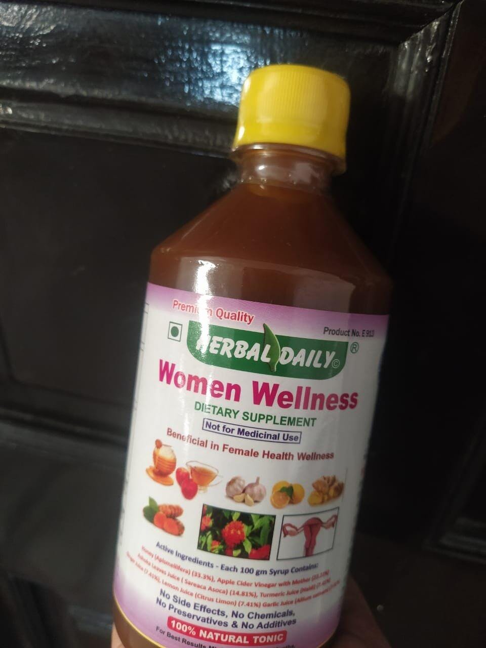 Ingredients: Women Wellness Syrup contains Ashoka leaves juice, Turmeric (Haldi) juice, Garlic juice, Ginger juice, Lemon juice, Honey, and Apple Cider Vinegar with Mother.
